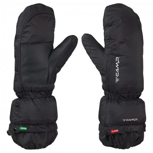 Lightweight, compact insulated mittens designed for high-altitude mountaineering. The Hotmitt'N features premium down insulation for great warmth and good temperature regulation. The windproof fabric adds an extra layer of protection against the extreme conditions typical of the high peaks. The simple and secure Open-Close system on the cuff maximizes thermal insulation by creating a solid seal against the jacket and can be easily closed or opened even while wearing gloves – just pull on the Close side to snug it up and the Open side to release and open. Complete with stuff sack for tighter packability.