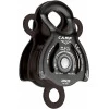 A high strength multifunctional double pulley for block-and-tackle systems and complex operations. Features large wheels, a main attachment point that accommodates three carabiners, and a large becket with a large bottom attachment point and two secondary attachment points on the sides for linking, positioning and attaching progress capture systems. For use with ropes up to 16 mm. Prusik minding, the self-locking knot can be installed on both sides of both wheels. Self-lubricated bushings are sufficient for light applications at low speed. Efficiency: 90%. Aluminum alloy body and wheels, stainless steel axle.